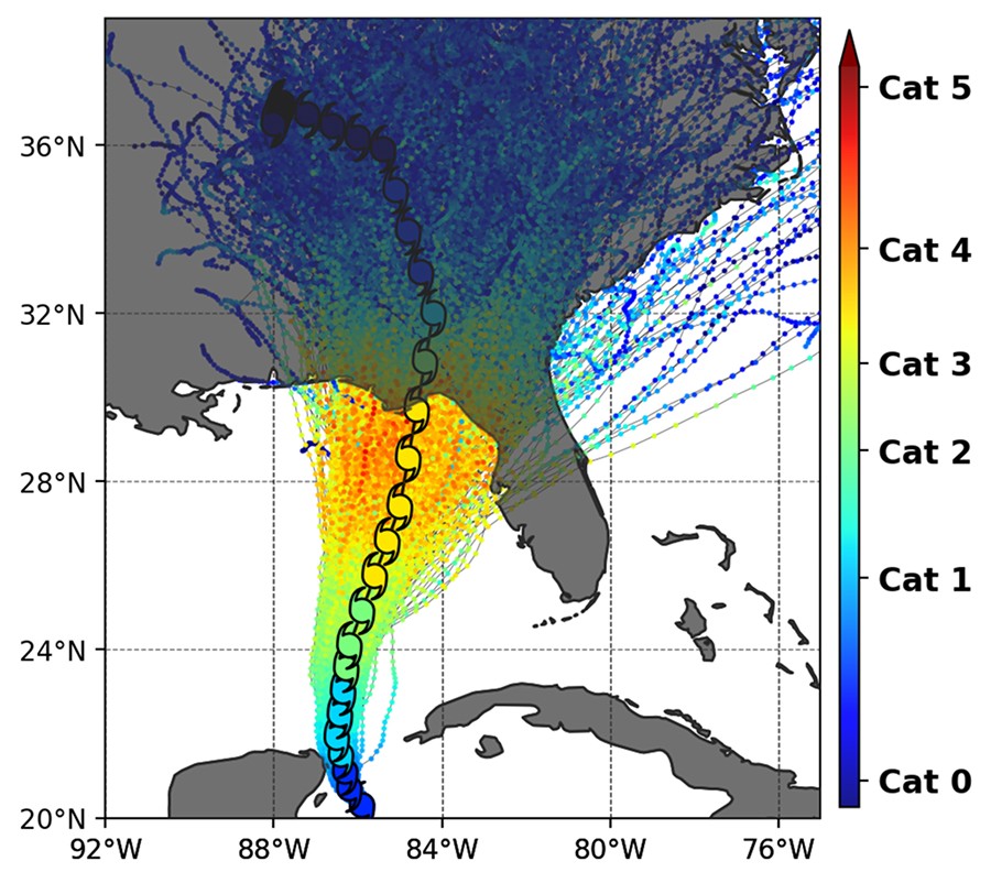 Figure 1: NHC forecast with 1,000 LiveCyc realisations for Hurricane Helene (2024) 48 hours before landfall
