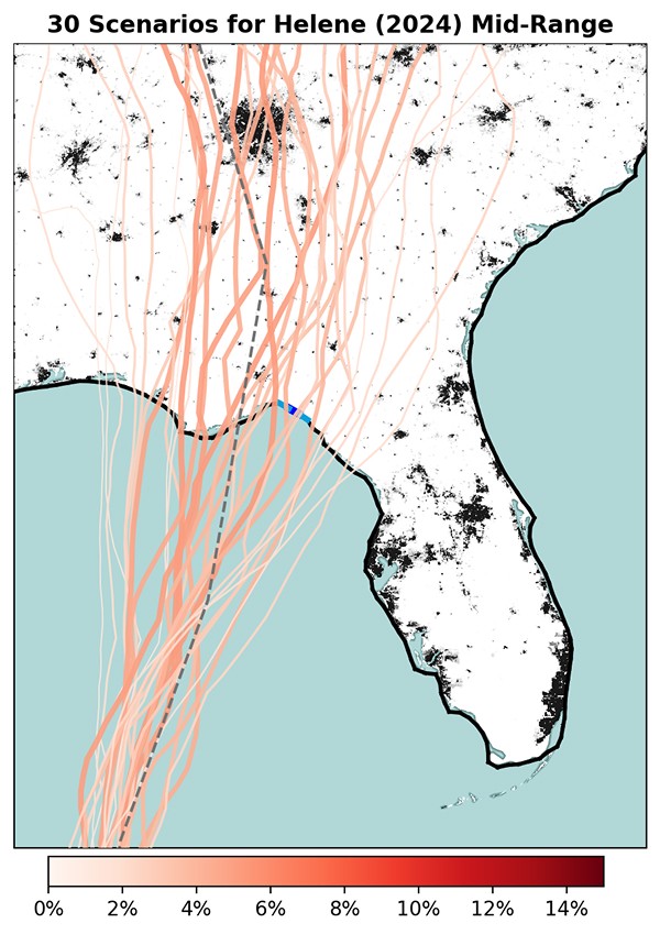 Figure 2: LiveCyc scenarios for Hurricane Helene (2024), with probability of occurrence. The dashed black line shows the NHC 48-hour forecast; the blue gate indicates the observed landfall location.