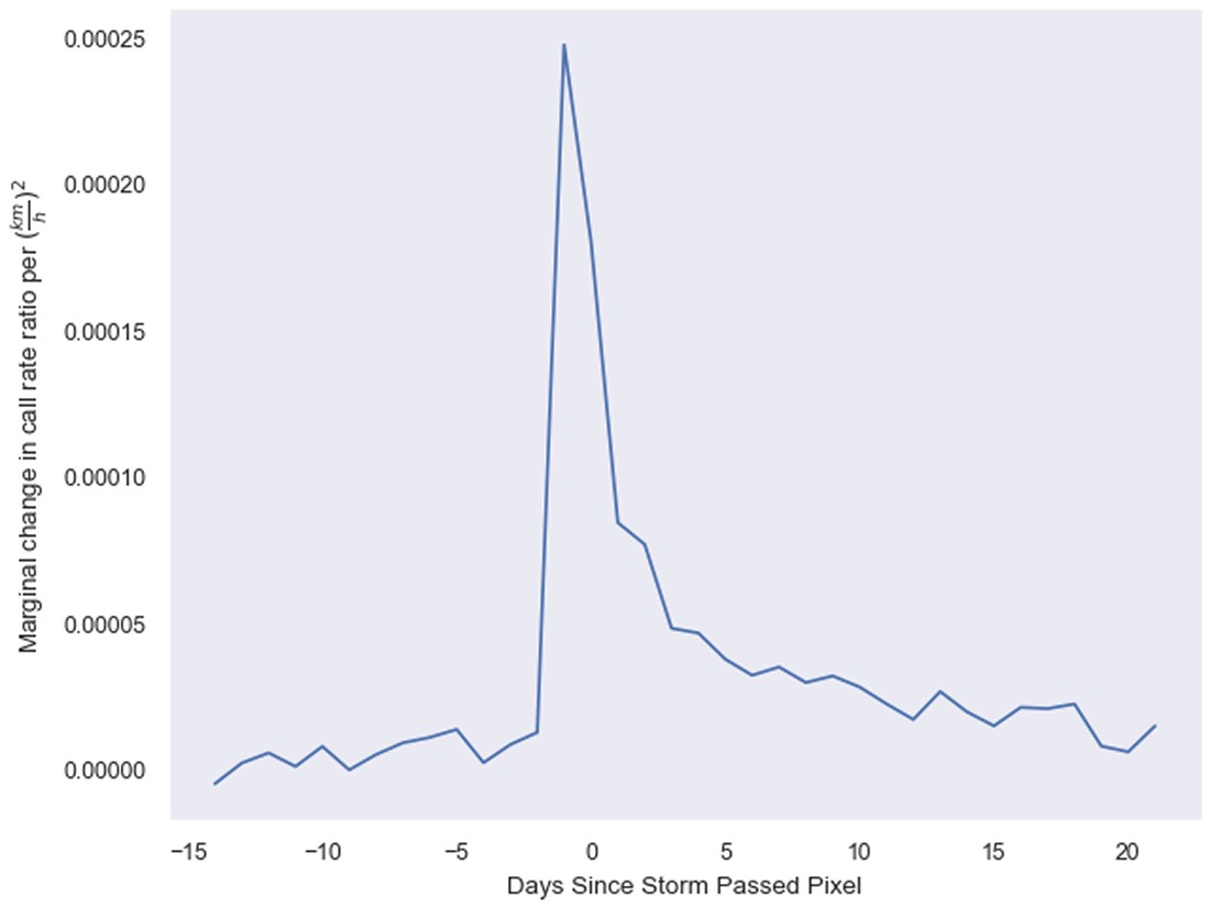 As shown in Figure 5, the strongest relationship between wind and call volume occurs just as the storm hits a location, tapering off in the days that follow.