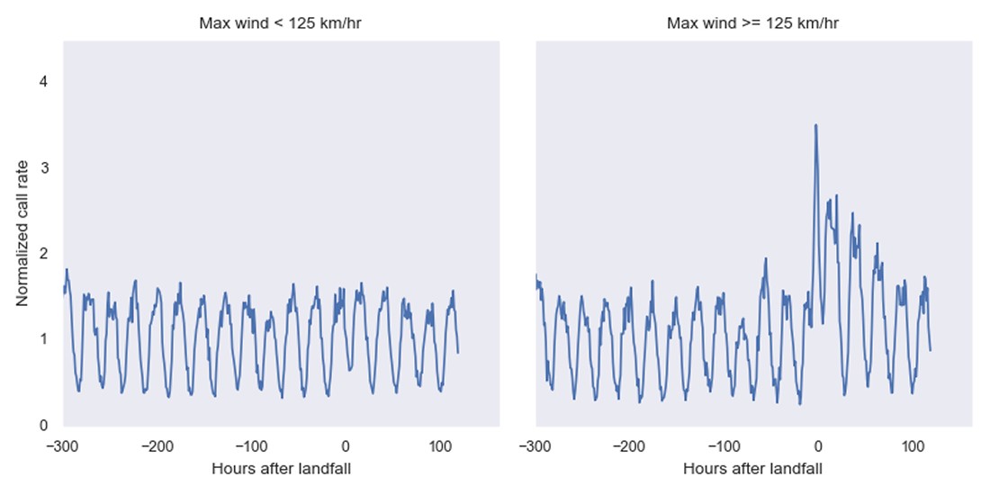 Figure 4. Normalized call rate aggregated across all locations experiencing <125 km/hr maximum wind gusts (left) and all locations experiencing >=125 km/hr maximum wind gusts (right) during Hurricane Milton. Data: RapidSOS (calls), Reask (wind gust).