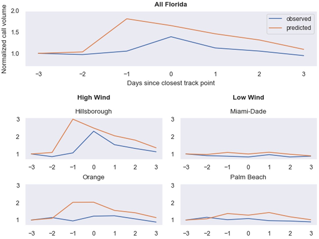 Low-wind counties showed little change in observed and predicted calls. Hillsborough County (Tampa Bay) had a quite accurate peak call volume prediction, though again, like the full state aggregation, predicts the spike to occur slightly earlier than it does.