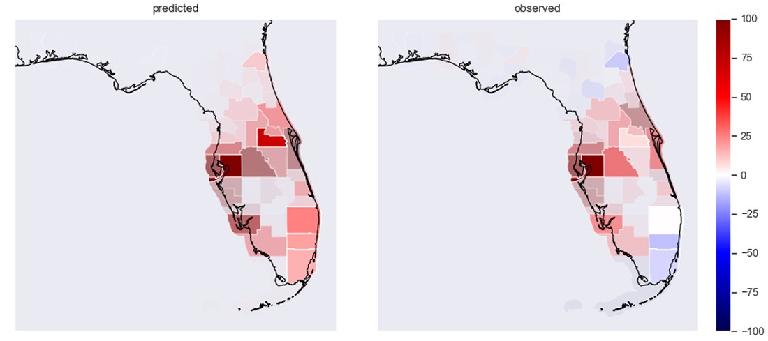 We then applied this model to Milton’s wind data to test its predictive power. Figure 6 shows how the model performed across Florida overall, and within selected counties.
