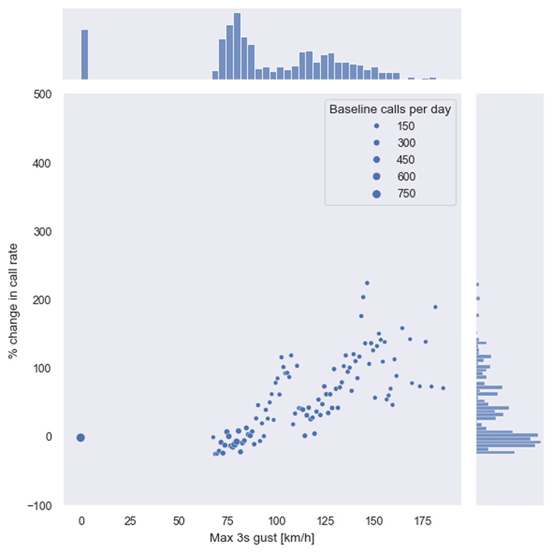 Figure 3. Bin scatter of CRR vs. maximum 3-second wind gusts. Bins with less than 20 baseline calls are excluded to reduce noise. The size of each point is proportional to daily call rate in the baseline period within each bin. Marginal distributions of CRR and wind speed are shown along the plot edges. Data: Reask (wind gust), RapidSOS (CRR).