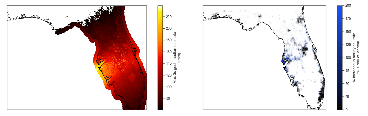Figure 2 illustrates this, highlighting the Tampa Bay area as having both the highest wind speeds and most significant surge in emergency calls, measured as the call rate ratio, or CRR, which we define as the ratio of call rate during a 48-hour landfall window to a 3-week pre-event baseline window, accounting for day-of-week patterns.