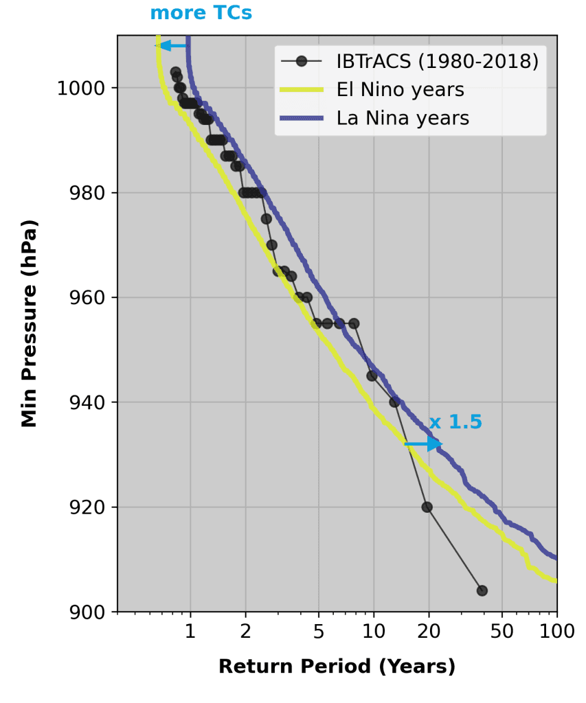 Thanks to this climate-connected framework our models can investigate the impact of climate variability on risk. As an example, Figure 3 illustrates the return period and associated tail risk of tropical cyclones around the Pacific island of Vanuatu depending on the El-Niño / La-Niña phases.